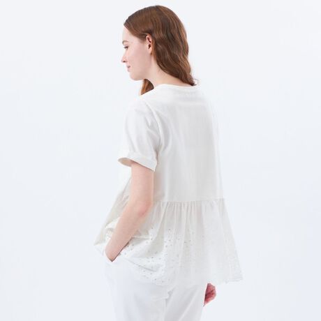 滑らかなスムース素材とエンブロイダリーレースを組み合わせることで、Tシャツのカジュアルさとブラウスの上品さを兼ね備えています。