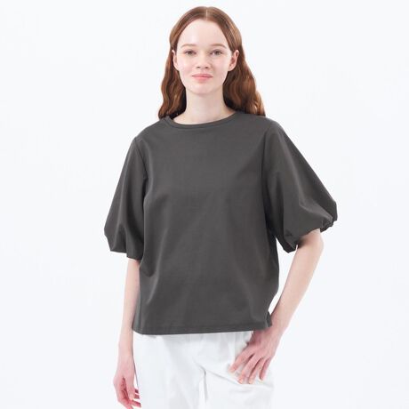 袖部分にはハリのある素材を使用し、立体感のあるシルエットを実現。身頃には光沢感のあるスムースカットソーを使用することで、カットソーながらブラウスのようなキレイ目アイテムとして活躍します。