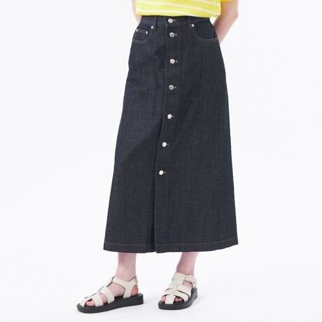 コットンリネンデニムシリーズに、フロントボタンが特徴となるロングスカートが新登場。
