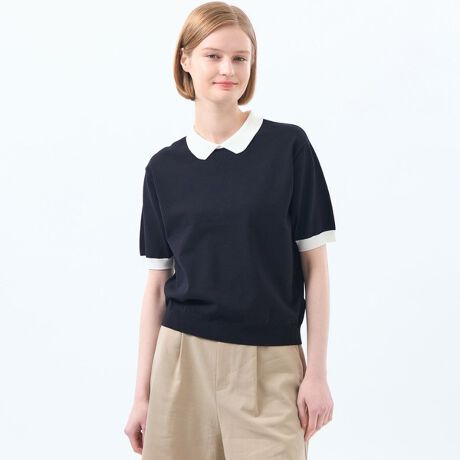 襟と袖口のバイカラーがアクセントになった、シンプルで上品さのあるニットプルオーバー。