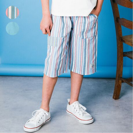 普段使いに動きやすく快適な柔らかカットソー素材のハーフパンツ。膝が隠れるくらいの6分丈。さりげない配色がポイント。【アイテム】シンプル ベーシック 無地 カジュアル お洒落 オシャレ かっこいい かわいい 可愛い 普段着 お外着 お外遊び着 デイリーウェア お出かけ着 ハーフパンツ 短パン 半パン 半ズボン ボトムス 子ども こども 男児 男の子 ボーイズ キッズ ベビーサイズ トドラーサイズ 幼稚園 保育園 小学校 通園 通学 小学生 2025年春夏物新作 丸高衣料 水色 ストライプ クレセント コットン100% 綿100%