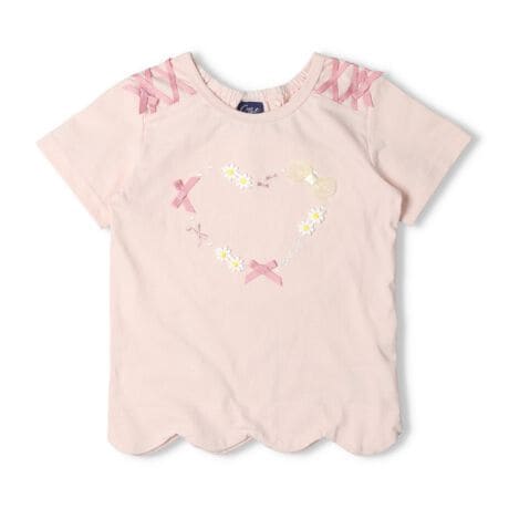 肩のレースアップやリボン使いやリボンのモチーフなどが今っぽいデザイン。裾のスカラップデザインも女の子らしい半袖Tシャツ。襟ぐりの後ろ部分がゴム仕様になっているので、着脱も楽ちんです!【アイテム】トップス シンプル ガーリー フェミニン カジュアル お洒落 オシャレ かわいい 可愛い 普段着 デイリーウェア お出かけ着 お外着 お外遊び着 子ども こども 女児 女の子 ガールズ キッズ ベビーサイズ トドラーサイズ 幼稚園 保育園 小学校 通園 通学 小学生 2025年春夏物新作 丸高衣料 ラベンダー 薄紫色 ピンク クレセント