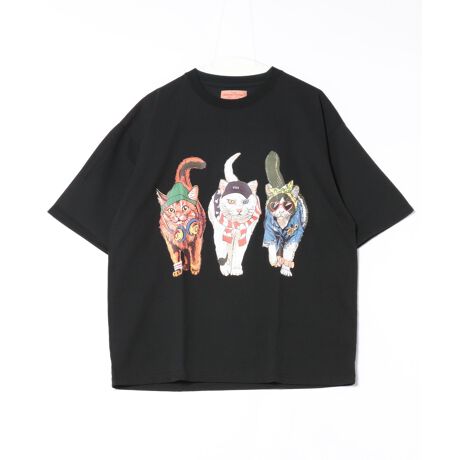 オシャレした犬猫たちがこちらへ向かって来るようなグラフィックを前後にプリントしたユニークなTシャツです。