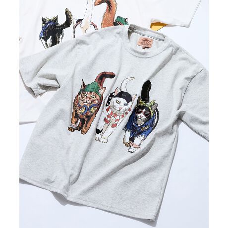 オシャレした犬猫たちがこちらへ向かって来るようなグラフィックを前後にプリントしたユニークなTシャツです。