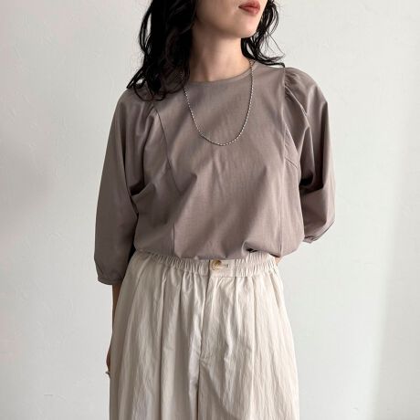 ・ふんわりしたお袖や切替デザインがポイントの布帛見えのカットソーブラウスです