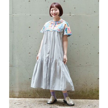 身頃とお袖に刺繍を施したロングワンピースは裾にも切り替えをいれ、可愛らしさを感じさせる一着に仕上げました。