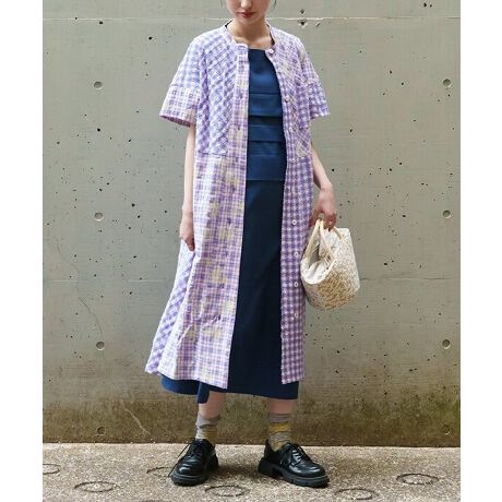 プリント入りのチェック生地と細かくループが出たふわふわとしたチェック生地をMIXしたワンピース。