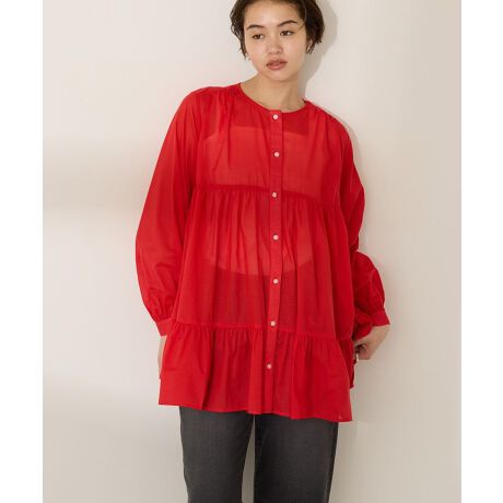 女性らしいシルエットが夏のコーディネートに映えるロングブラウス。ほんのり甘いシアー素材をティアードデザインでふんわりと仕上げたエアリーな1着です。前ボタンを開けてさらっと羽織として着るのもおすすめ。デニムはもちろん、スリムパンツに合わせるだけで旬なスタイリングを後押ししてくれるおしゃれなアイテムです。透け感[あり]