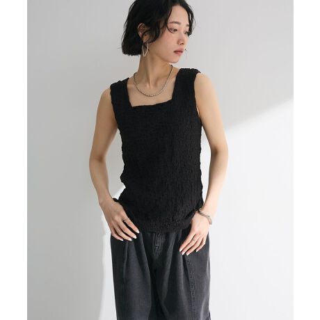 コーディネートのワンポイントに最適なポコポコ表面感のタンクトップ。程よく身体にフィットするコットンベースのストレッチ素材で、すっきりとしたシルエットを演出します。スクエア&ラウンドネックを楽しめる2WAY仕様なのも嬉しいポイント。1枚ではもちろん、シャツや薄手アウターと合わせることでヘルシーな肌見せが叶うおすすめのアイテムです。透け感[なし]