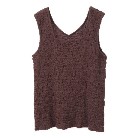 コーディネートのワンポイントに最適なポコポコ表面感のタンクトップ。程よく身体にフィットするコットンベースのストレッチ素材で、すっきりとしたシルエットを演出します。スクエア&ラウンドネックを楽しめる2WAY仕様なのも嬉しいポイント。1枚ではもちろん、シャツや薄手アウターと合わせることでヘルシーな肌見せが叶うおすすめのアイテムです。透け感[なし]