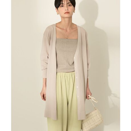 すっきりとしたVネックにIラインシルエットのロングカーディガン。清涼感のあるやや薄手のニット生地でサマーシーズンにも快適にご着用いただけます。ご家庭の洗濯機で洗えるイージーケア仕様なのも嬉しいポイント。シンプルなワンカラーでコーディネートに取り入れやすく、春夏の羽織りアイテムとして活躍してくれます。透け感[ややあり]