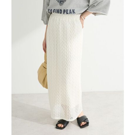 シーズンムード高まるレース素材で仕立てたデザインスカート。ウエストは総ゴムで楽な穿き心地ながら、真っ直ぐなシルエットがレッグラインを美しく演出します。着回しやすいベーシックカラーとアクセントとなるグリーンを加えた色展開にも注目。合わせるアイテム次第でフェミニンにもカジュアルにもマッチするおすすめのアイテムです。透け感[ややあり]