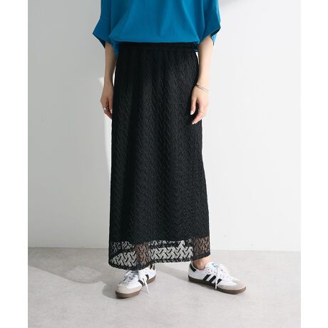 シーズンムード高まるレース素材で仕立てたデザインスカート。ウエストは総ゴムで楽な穿き心地ながら、真っ直ぐなシルエットがレッグラインを美しく演出します。着回しやすいベーシックカラーとアクセントとなるグリーンを加えた色展開にも注目。合わせるアイテム次第でフェミニンにもカジュアルにもマッチするおすすめのアイテムです。透け感[ややあり]