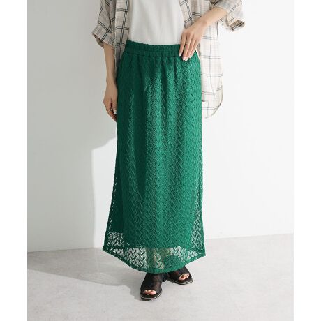 シーズンムード高まるレース素材で仕立てたデザインスカート。ウエストは総ゴムで楽な穿き心地ながら、真っ直ぐなシルエットがレッグラインを美しく演出します。着回しやすいベーシックカラーとアクセントとなるグリーンを加えた色展開にも注目。合わせるアイテム次第でフェミニンにもカジュアルにもマッチするおすすめのアイテムです。透け感[ややあり]