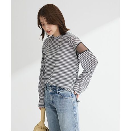 いつものコーディネートをモードに切り替えるデザインカットソー。さらりと肌触り良い天竺素材で、伸び良く快適な着心地が魅力的な1枚です。ベーシックなシルエットながら、肩のチュール切り替えがスタイリングのアクセント使いにぴったり。霜降りのような表面感の無地カラーとモノクロボーダーの着合わせしやすい4色展開です。透け感[あり]