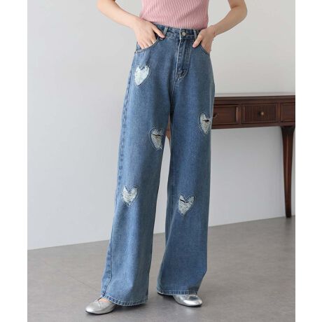 年中着用できる定番のデニムに、ガーリーなハート型のダメージ加工を施しました。