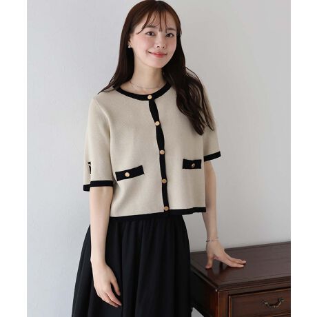 配色に金釦がアクセントになったクルーネック半袖ニットカーディガン。