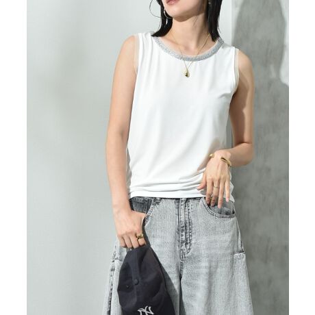 襟ぐりに施されたアビガイルテープがポイント。アビガイルとはメタリックチェーンテープとも呼ばれ、ラメフィルムを巻いた糸を編んだテープです。ざっくりとした編みと立体的なフォルムが特徴です。またラメフィルムを使っいながらソフトな風合いと、上品な発色の良さも魅力。アビガイルがチラリと見えるだけでコーディネイトに華やかさをプラスしてくれます。ネックの開いたカットソーやワンピース、シャツのインナーとして活躍すること間違いなしです。また、夏に向けてリネンやコットンとも相性が良く、アウトドアやフェスなどの野外イベントでも目を惹くお勧めな1枚です。