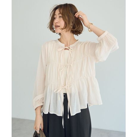 3段のシャーリングティアードにフロントリボンがフェミニンなシアーブラウス。軽やかな質感が優しい着心地のデザインです。前後どちらを前にしても着用いただける2WAY仕様で羽織としても活躍するマルチな一着。落ち感のあるボリュームスリーブがふんわりと優しい印象をプラスし、シーズナルなレイヤードコーデを楽しんでいただけるおすすめのアイテムです。透け感[あり]
