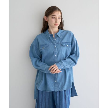 テンセル混のような柔らかなハリのあるシャンブレー生地を使用したデニムシャツ。ウエスタンシャツをベースに、襟型やワークポケットなど細かなディテールにこだわりを詰め込んだ1枚です。背面プリーツでふんわりと広がる柔らかなシルエットが抜け感を演出。メイントップスとしてはもちろん、インナーやカーディガンを合わせたコーディネートもおすすめです。透け感[なし]