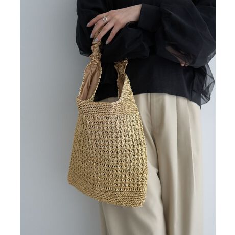 煌めくメタリックコードの柄編みがスタイリッシュなトートバッグ。くしゅくしゅとさせたギャザーハンドルがフェミニンな雰囲気をプラス。程よい長さで肩掛けしやすいのも嬉しいポイントです。フラットなスクエアフォルムとシャイニーな素材感が、スタイリングにトレンド感をプラスしてくれるおすすめのアイテムです。