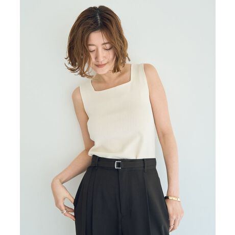 スクエア&ラウンドネックの前後2WAYで着用出来るノースリーブニット。ハイゲージ編みでカジュアルすぎず、きれいめスタイルにも最適です。程よく開いたネックラインがデコルテ周りを美しく演出。夏シーズンのメイン使いとしてはもちろん、ジャケットのインナーとしても活躍してくれる汎用性の高いアイテムです。透け感[なし]