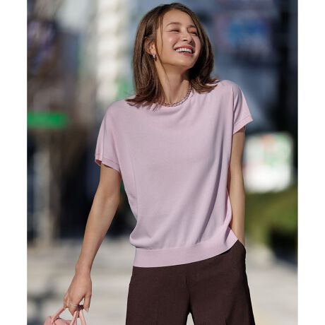 ■デザインデコルテラインを綺麗に見せるラウンドネック、肩まわりをカバーするフレンチスリーブと、身体に沿い過ぎない程よくゆとりのあるサイズ感でスタイルアップ効果が叶います。1枚ではもちろん、コンパクトなのでジャケットのインナーとしてもおススメのアイテムです。シンプルなデザインながら、バックスリットと後ろのセンターシームがポイントとなり、後ろ姿も抜かりなくきれいに仕上がります。