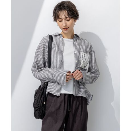 ポケットのテープ刺繍がアクセントになった、着るだけで今っぽく小洒落て見えるクロップド丈のシャツ。程よいゆとり感のボディに少し太めのカフスをあしらった、シンプルながらも他にはない1枚です。リネン素材特有のナチュラルな風合いで、きれいめ感とカジュアル感を絶妙なバランスで表現して頂けます。カラーは、清潔感のあるホワイト(#001)、品のあるネイビー(#075)、肌なじみのいいベージュ(#033)の無地3色と、こなれ感のあるダークブラウンストライプ(#135)、大人可愛いラベンダーストライプ(#183)のストライプ2色の計5色展開です。