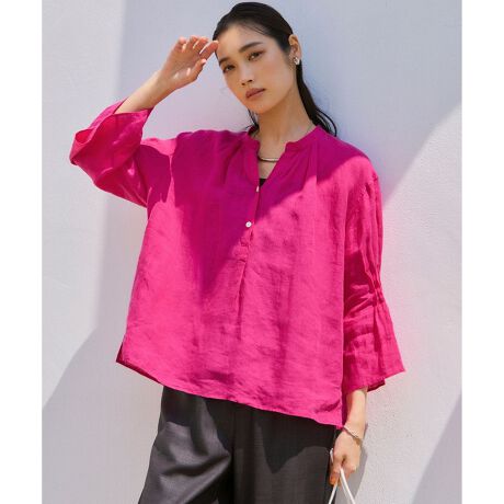 袖のタックがポイントのデザインシャツ。袖にインパクトを持たせつつ、ボディはすっきりとさせることでバランスよく着ていただける1枚です。リネン素材特有の清涼感で軽やかな着こなしを叶えてくれます。カラーは、清潔感のあるホワイト(#001)、キャッチ―なマゼンタ(#011)、品のあるネイビー(#075)、肌なじみのいいベージュ(#033)の無地4色と、華やかなトマトストライプ(#120)、ニュアンスカラーが今っぽいダークグリーンストライプ(#162)、こなれ感のあるダークブラウンストライプ(#135)、大人可愛いラベンダーストライプ(#183)のストライプ4色の計8色展開です。