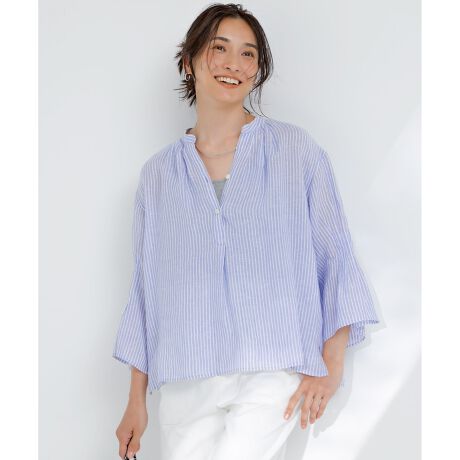 袖のタックがポイントのデザインシャツ。袖にインパクトを持たせつつ、ボディはすっきりとさせることでバランスよく着ていただける1枚です。リネン素材特有の清涼感で軽やかな着こなしを叶えてくれます。カラーは、清潔感のあるホワイト(#001)、キャッチ―なマゼンタ(#011)、品のあるネイビー(#075)、肌なじみのいいベージュ(#033)の無地4色と、華やかなトマトストライプ(#120)、ニュアンスカラーが今っぽいダークグリーンストライプ(#162)、こなれ感のあるダークブラウンストライプ(#135)、大人可愛いラベンダーストライプ(#183)のストライプ4色の計8色展開です。
