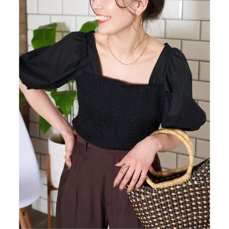 スクエア型のデコルテラインがヘルシーなシャーリングブラウス。
