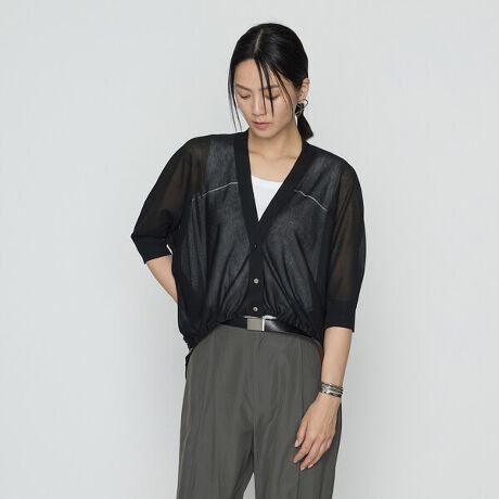 シアーなニットに裾のドローストリングでつくり出すギャザーシルエットが女性らしいドロストシアーショートカーデです。