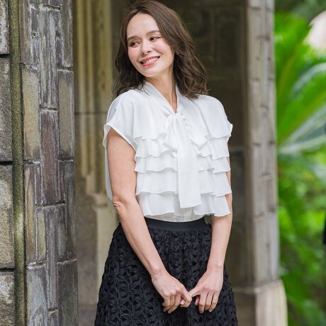 フェミニンなティアードデザインの華やかなブラウス。
