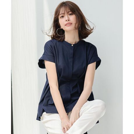 シルエットが活きてメリハリのあるスタイリングに仕上がるため、テーパードパンツなどの細身のパンツと好相性。すっきりとしたバンドカラーなので、お仕事シーンにはジャケットを羽織っても収まりが良くきちんと感を演出します。