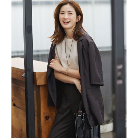 ハーフスリーブが新鮮なシングルブレストのテーラードジャケット。シアーな素材で裏無し仕様なのでシャツ感覚でお召いただけます。接触冷感や速乾性などの機能性も備わっているので、これからの季節に持っておきたい便利なアイテムです。またシンプルな着こなしや、ワンピースに軽く羽織るだけで程よいきちんと感と、今っぽさをプラスしてくれます。カラーは、モードな雰囲気漂うグレー寄りのダークブラウン(#004)、肌馴染みのいいベージュ(#033)、シーンを選ばないベーシックなブラック(#005)の3色展開です。