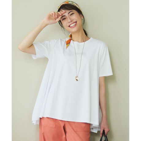 パネル切り替えを生かした裾フレアーのデザインTシャツ。袖丈は肘を程よくマークする絶妙な丈感で、長い期間楽しめます。脇のハンカチーフヘムはイレギュラーな動きが魅力で、ヒップをカバーしつつ、新鮮なシルエットに仕上げました。 あらゆるボトムと好相性で、細めのストレートパンツやすっきりとしたテーパードパンツ、柄パンツなどのパンツスタイルで合わせるとメリハリのついたスタイリングが完成します。カラーは、清潔感のあるホワイト(#001)、落ち着いた印象のグレー(#004)、やさしい雰囲気のベージュ(#033)、洒落感のあるダークグリーン(#065)の4色展開です。