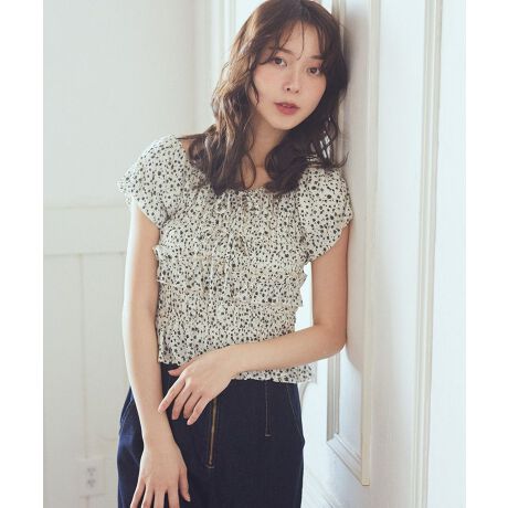 ふんわり膨らんだフレンチバルーン袖がポイントのデザインブラウス。身頃はシャーリング仕様でフィットし過ぎず、コンパクト丈にした事でどんなボトムとも相性良く着合わせしていただけます。子付き模様のフラワープリントに、身頃のフリルとリボンがよりフェミニンさを加速察せるアクセントに。オン・オフ問わずデイリーに活躍するおすすめの1枚です。