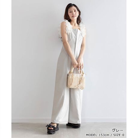 肩にあしらわれたフリルがフェミニンな印象を与えてくれるオールインワン。