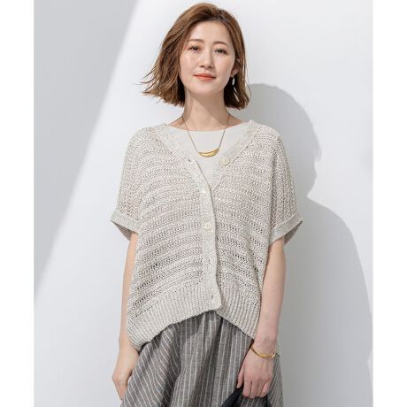 麻やペーパーヤーンなど夏らしくさらりとした3素材をミックスし、透かし編みで仕上げた素材です。ポリエステルスパンの糸を平たく仕上げることで麻のようなサラッとした風合いが楽しめます。麻はフレンチリネンを使用し、吸水発散性に優れた素材で肌触りがよく、コシの強さと丈夫さを兼ね備えています。