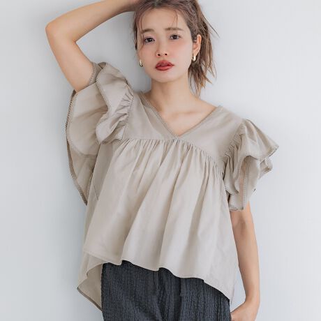 顔まわりをすっきりと見せてくれるVネックに、たっぷりフリルのボリューム袖がアクセント。