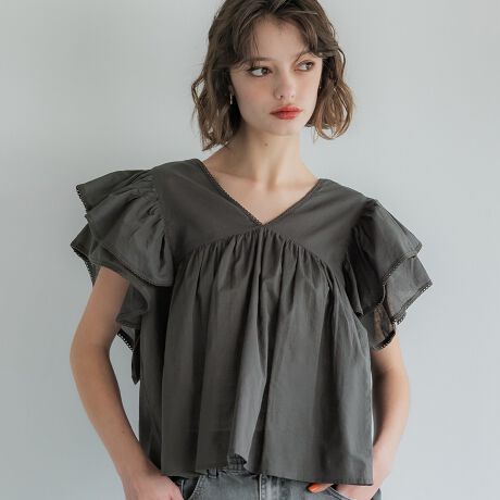 顔まわりをすっきりと見せてくれるVネックに、たっぷりフリルのボリューム袖がアクセント。