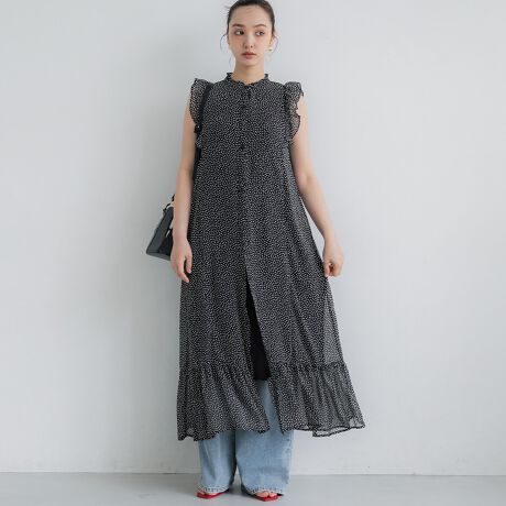 前開きデザインで着回し自在◎羽織としても使えるドットシフォンノースリーブワンピース