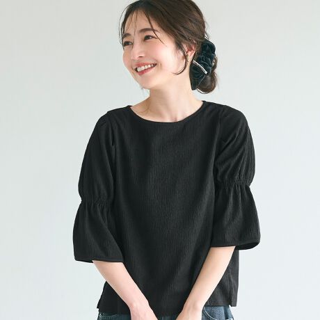 シャーリング生地とギャザースリーブがアクセントになる、快適5分袖ブラウス