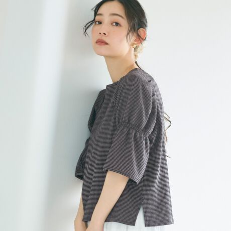 シャーリングと袖のギャザーで立体感のあるシルエットに仕上げた1枚。