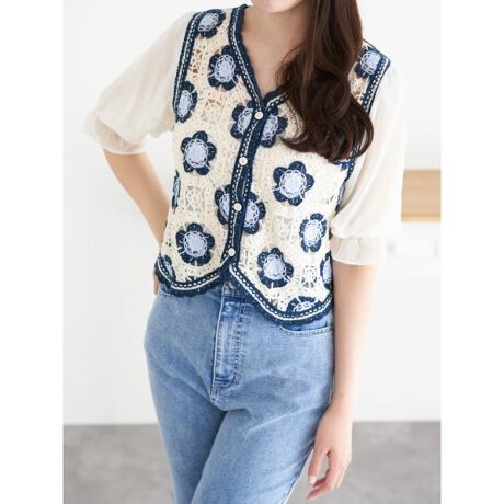 ・かぎ針ベストを着ている様なドッキングデザイン。