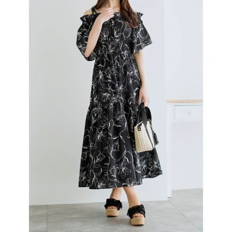 [2WAY]線画花柄オフショルワンピース