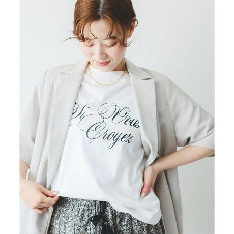 華奢な筆記体のフォントが遊び心がありながらも、上品な雰囲気のプリントTEE。