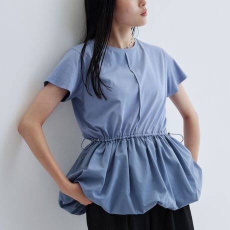 バルーンヘムのデザインが個性を引き立てるハーフスリーブトップス。