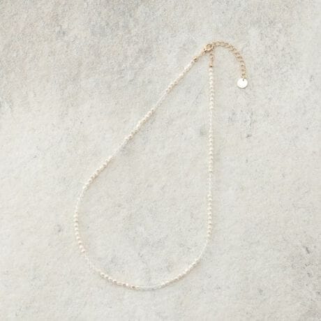 シンプルなトップスに合わせると華やかさがプラスするビーズネックレス