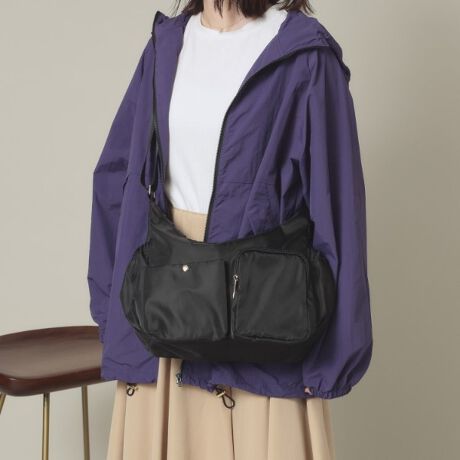 微光沢のあるツイル生地を使用した8ポケットショルダーバッグ。